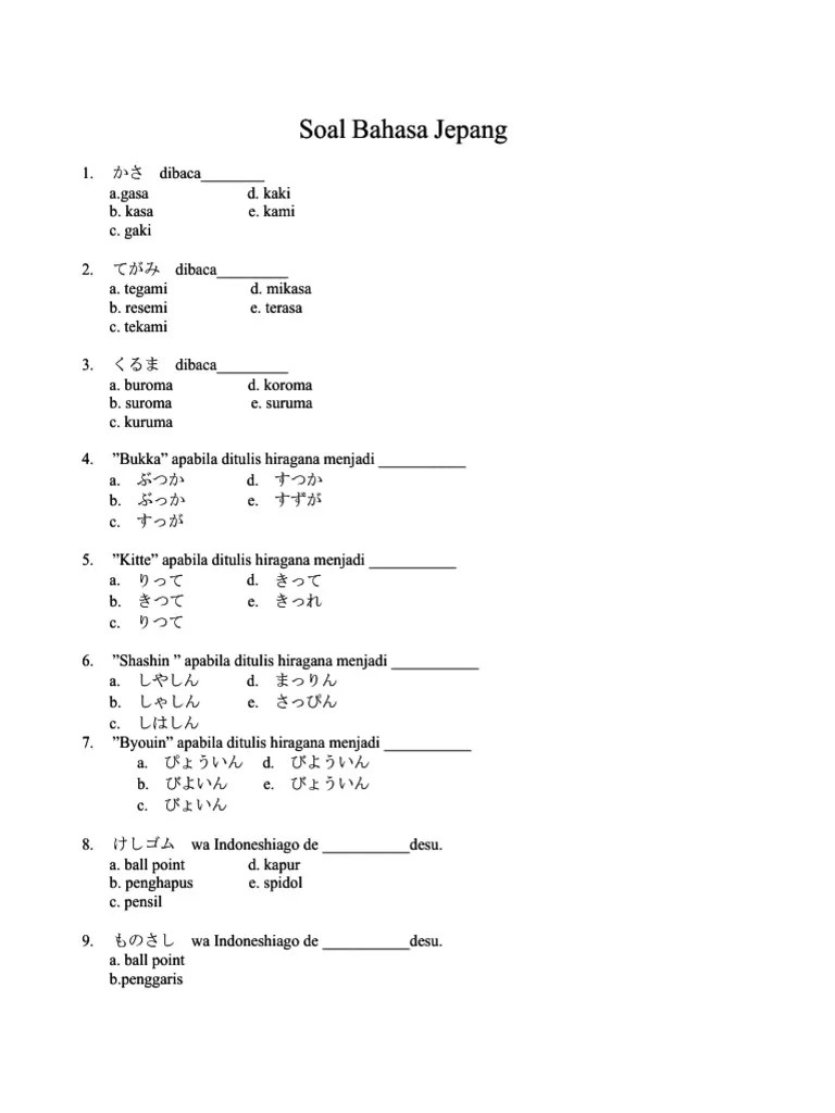 Buku soal tes bahasa jepang: Sma negeri 2 bandung mata pelajaran : Top score jlpt n5 materi soal pembahasan. 8/13/2019 soal bahasa jepang kelas 11 1/98/13/2019 soal bahasa jepang kelas 11 2/98/13/2019 soal bahasa jepang kelas 11 3/98/13/2019 soal . Belajar bahasa jepang online | wkwkjapan | materi sma kelas x & xiカテゴリー記事一覧. Dinas pendidikan kota semarang" yang penulis tulis ini dalam rangka memenuhi. Kaban no naka ni booruupen ga arimasu.kalimat disamping dalam bahasa indonesia memiliki arti. Contoh soal pilihan ganda bahasa . Di dalam tas ada buku. Bahasa jepang kelas / program : Soal kenaikan kelas bahasa jepang kelas xi tahun pelajaran 2012/2013 buatan. Materi uas bahasa jepang kelas xi semester ganjil. November 18, 2018 | author: